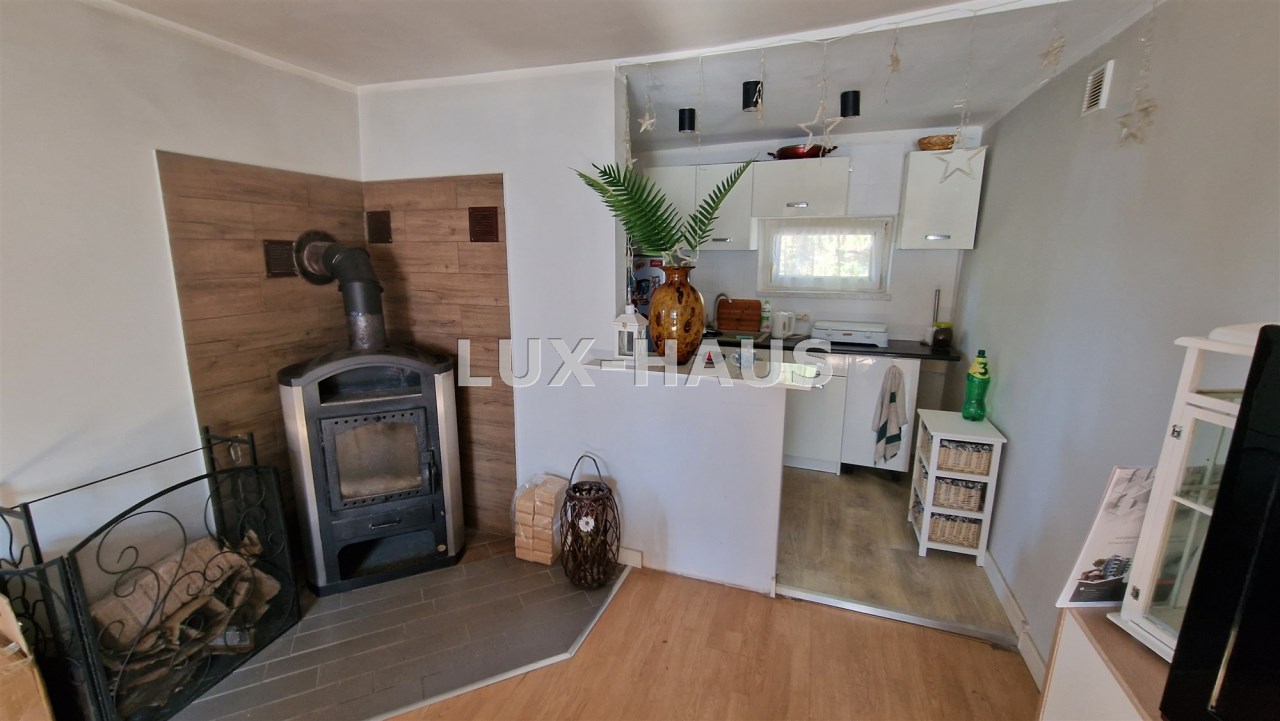 Domek ocieplony, ogrzewany kominkiem, woda z własnego ujęcia dostępna cały rok, prąd całorocznie.